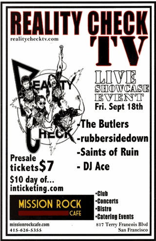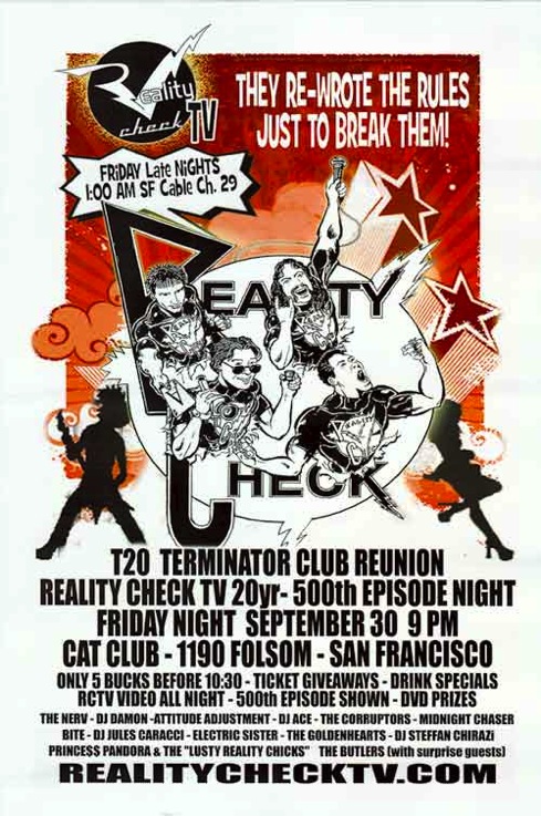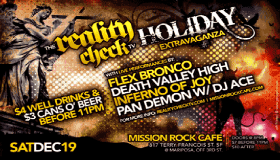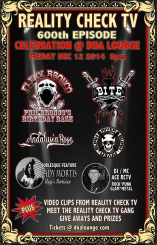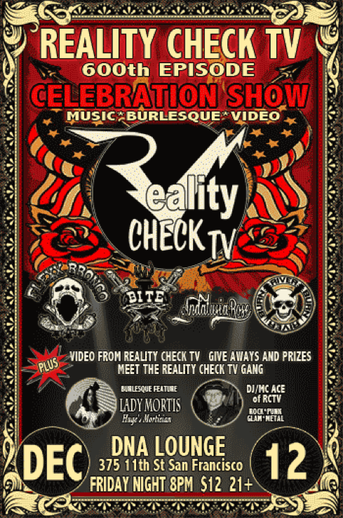 Reality Check TV is your host for some of the hottest live club shows in the Bay Area, Las Vegas and New York. Reality Check produces events starring your favorite bands, TV and Film pop culture icons, hot burlesque, and video art! You never know who will show up to a Reality Check TV party! Most parties include special guest stars, prizes, promotional give aways, drink specials and lots of Reality Check video!